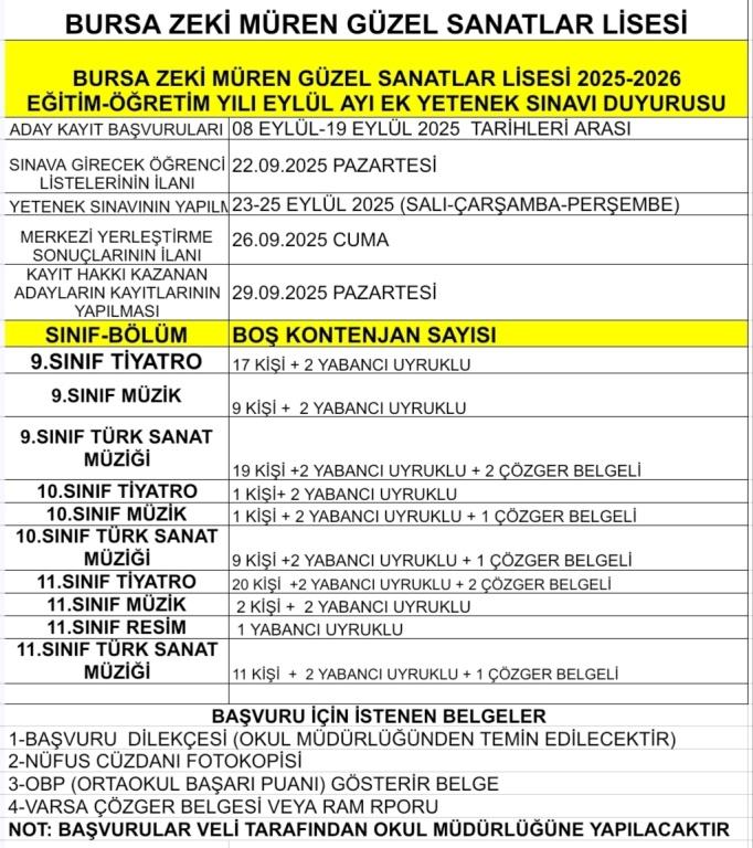 2025 2026 Eğitim Öğretim Yılı Eylül Ayı Ek Yetenek Sınavı Duyurusu